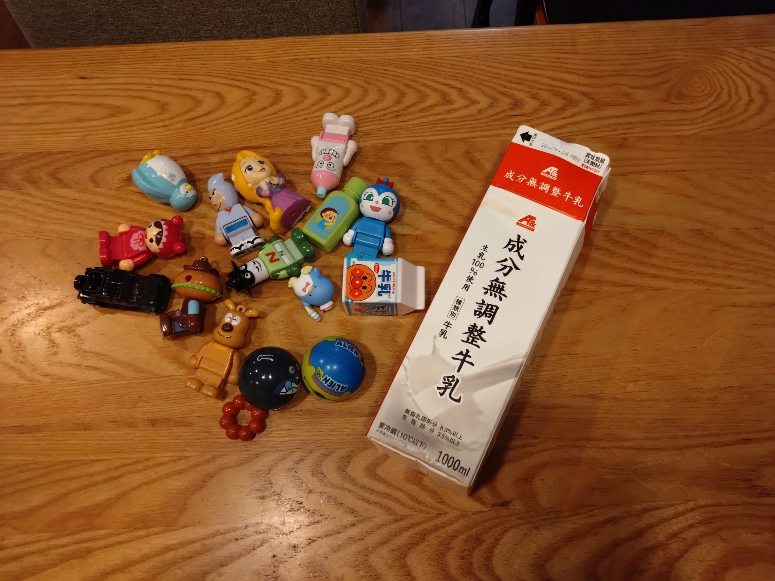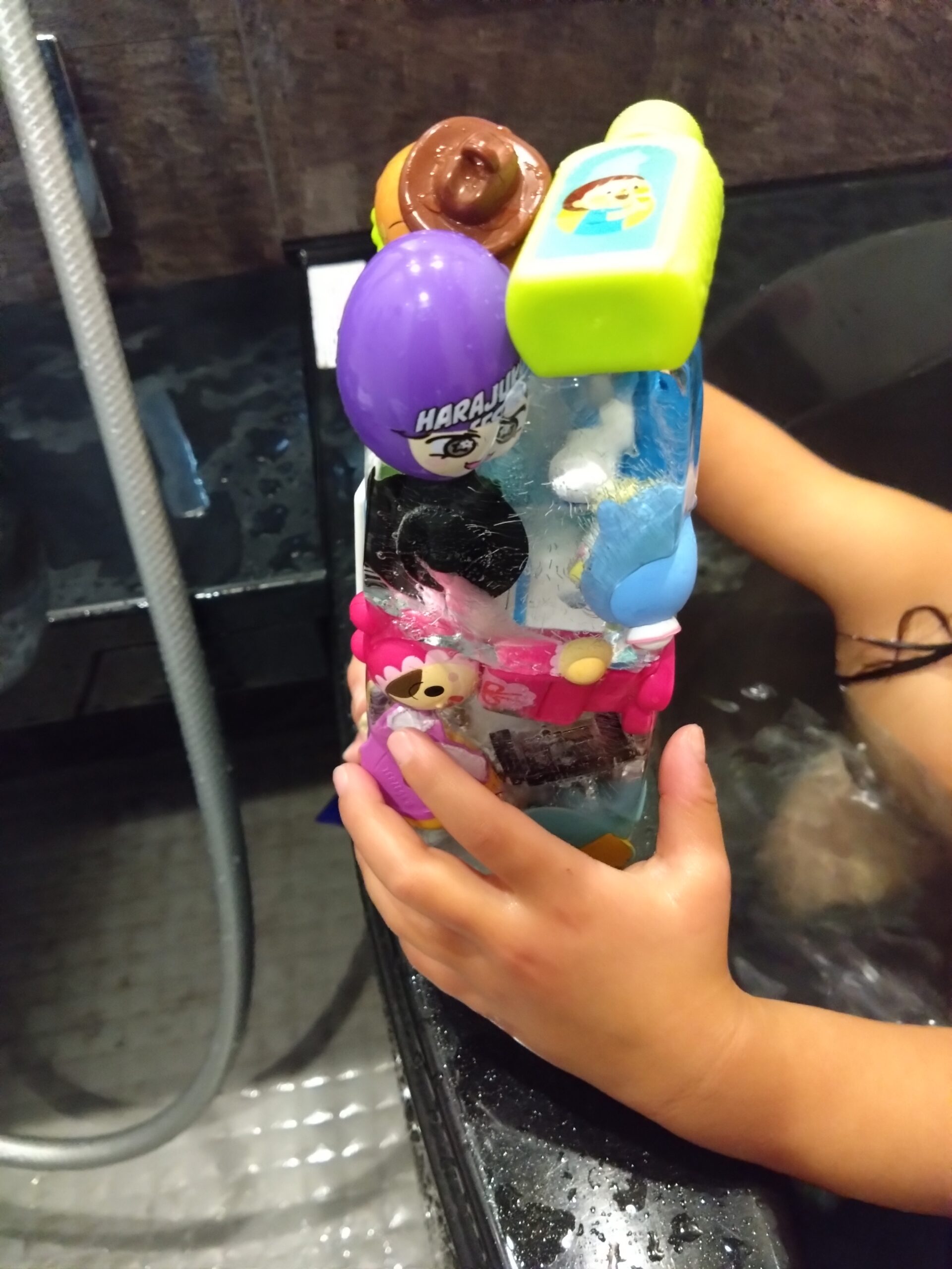 おもちゃを選んで、牛乳パックに入れて、水を入れて凍らせる。