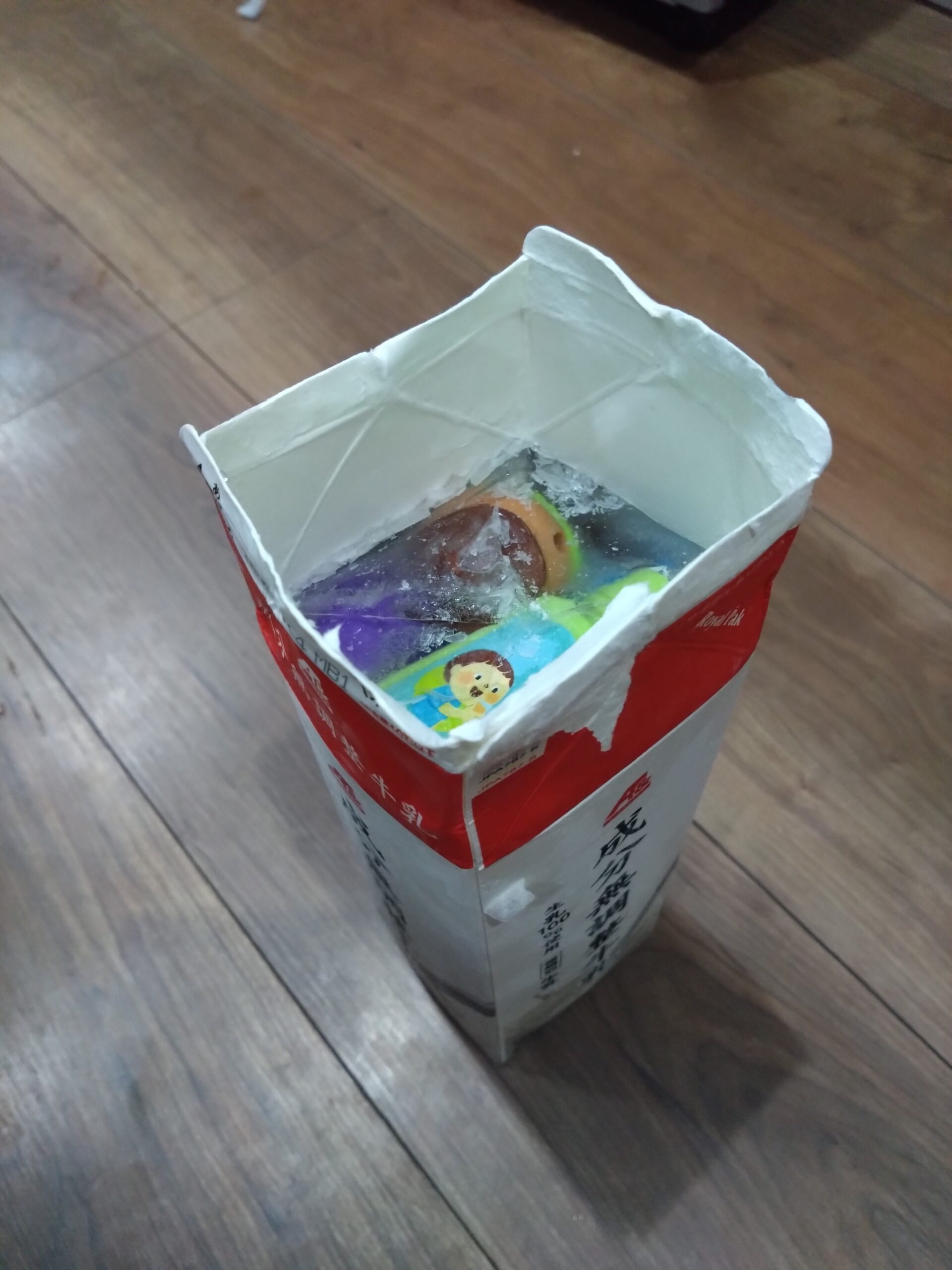牛乳パックに水と小さなおもちゃを入れて凍らせるだけ。